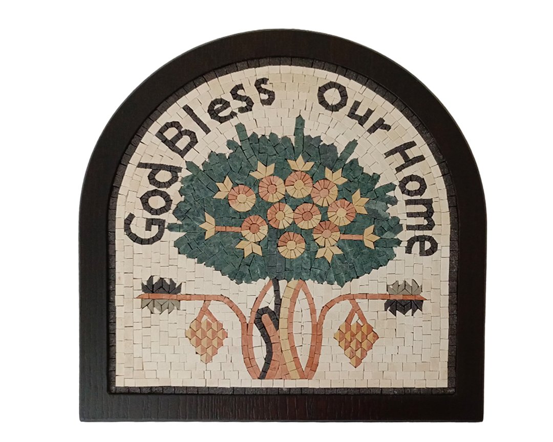 A handcrafted mosaic of the Madaba Tree with an elegant arch, measuring 35 × 35 cm. Customizable size, mounted on a wooden base, eco-friendly packaging, and free worldwide shipping.